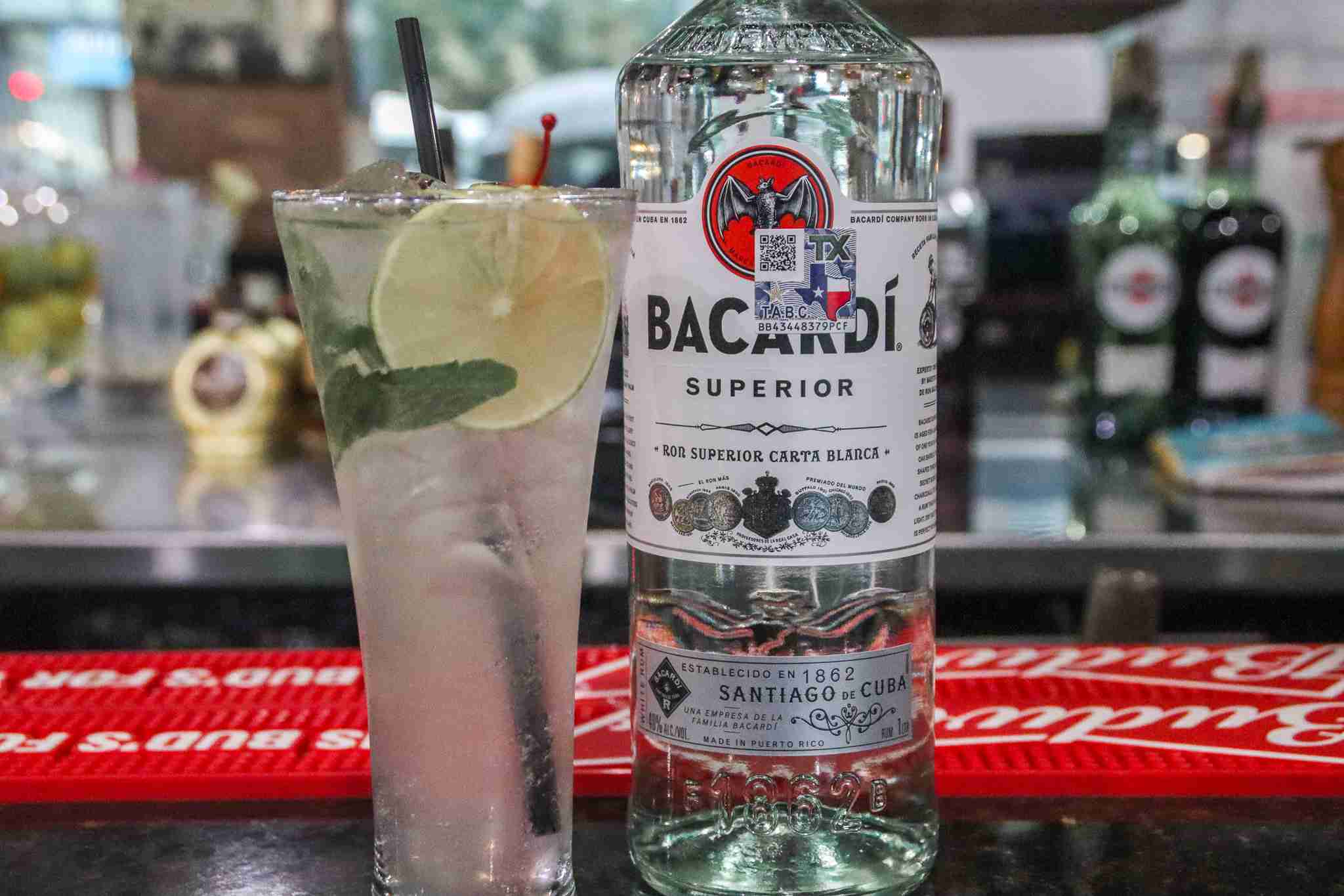 All Mojitos made with Bacardi Rum, Soda Water, Simple Syrup, Lime Juice, Triple sec, mint, garnish with cherry and lime.