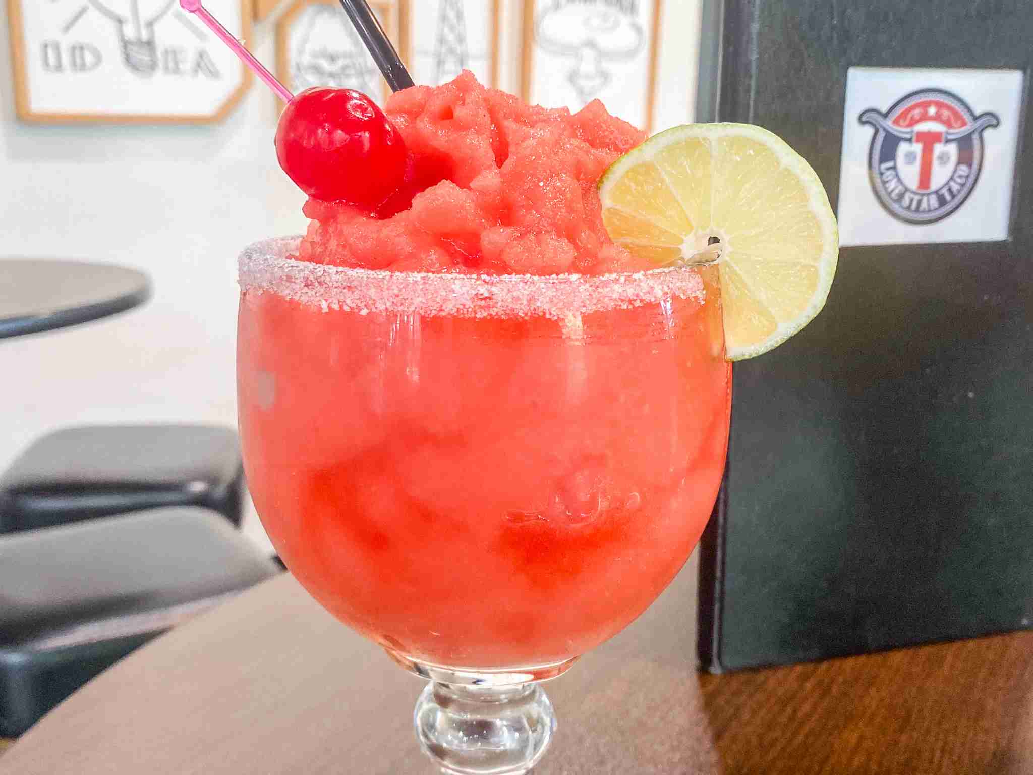 Patron Silver Tequila Watermelon, Puker's Chamoy, Lemon Juice Rimed with Tajin.