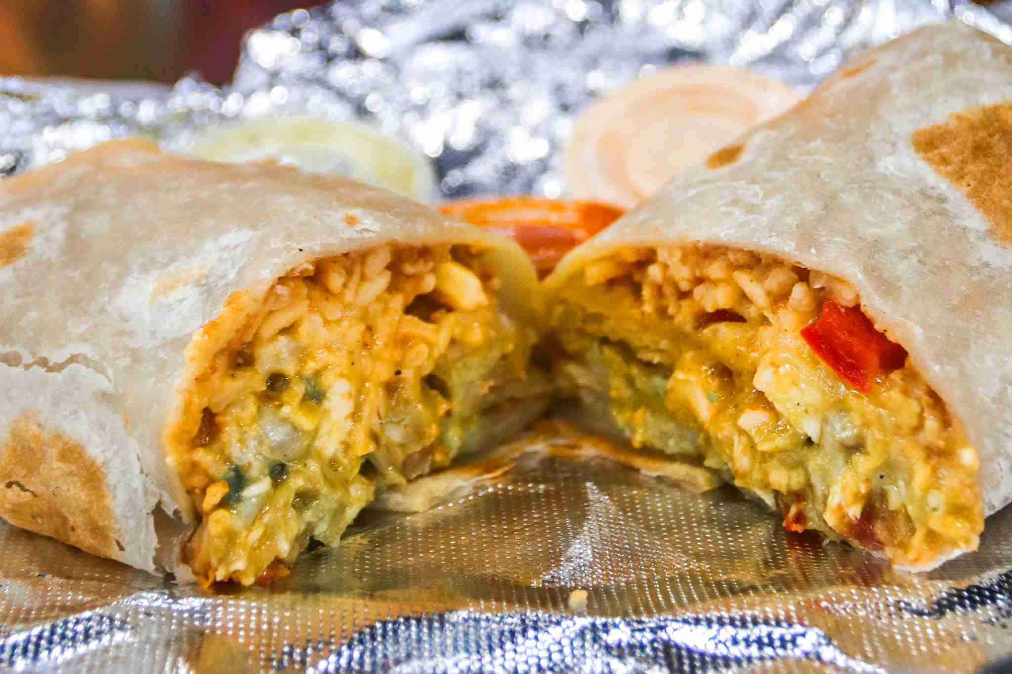 Your choice of beef, chicken or pork or veggies served with rice, beans, shredded cheese, pico de gallo, sour cream & guacamole. Choice of sauce and wrapped in a 12" flour tortilla.