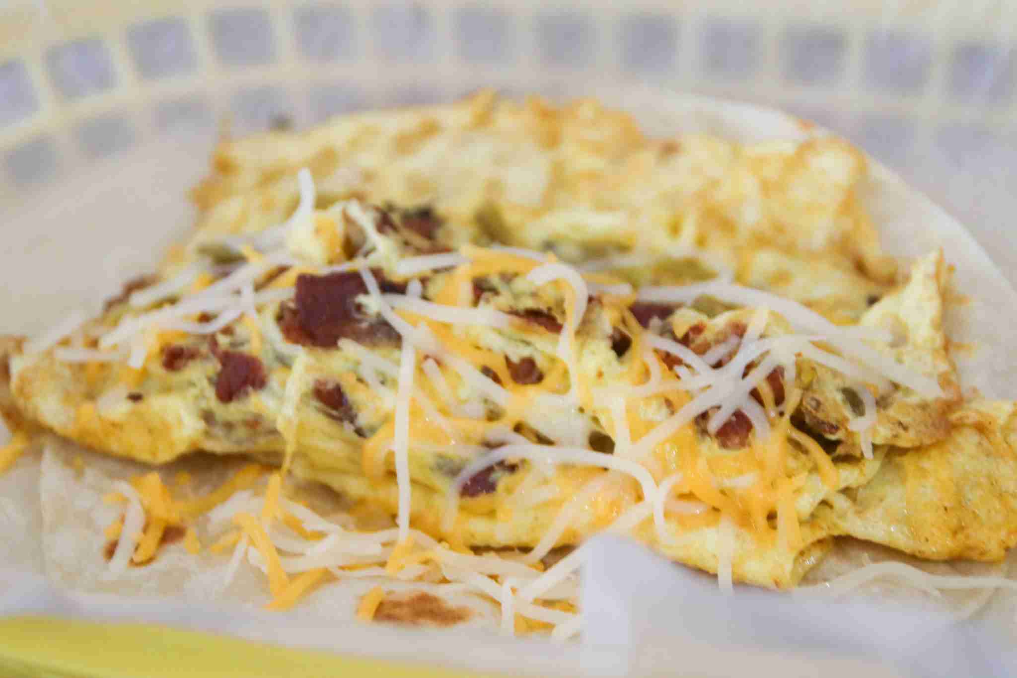 Bacon, green chillis and scramble eggs and sheared cheese.