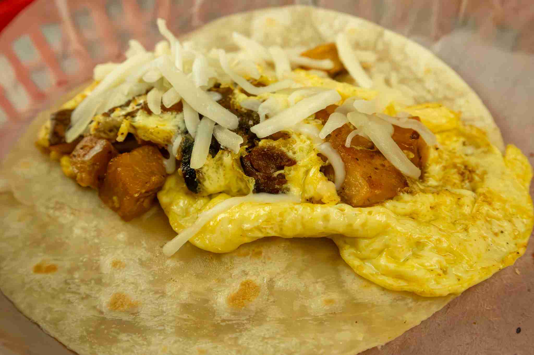 Scrambled eggs & potatoes topped with smoked beef brisket & shredded jack cheese. Served with tomatillo sauce on a flour tortilla.