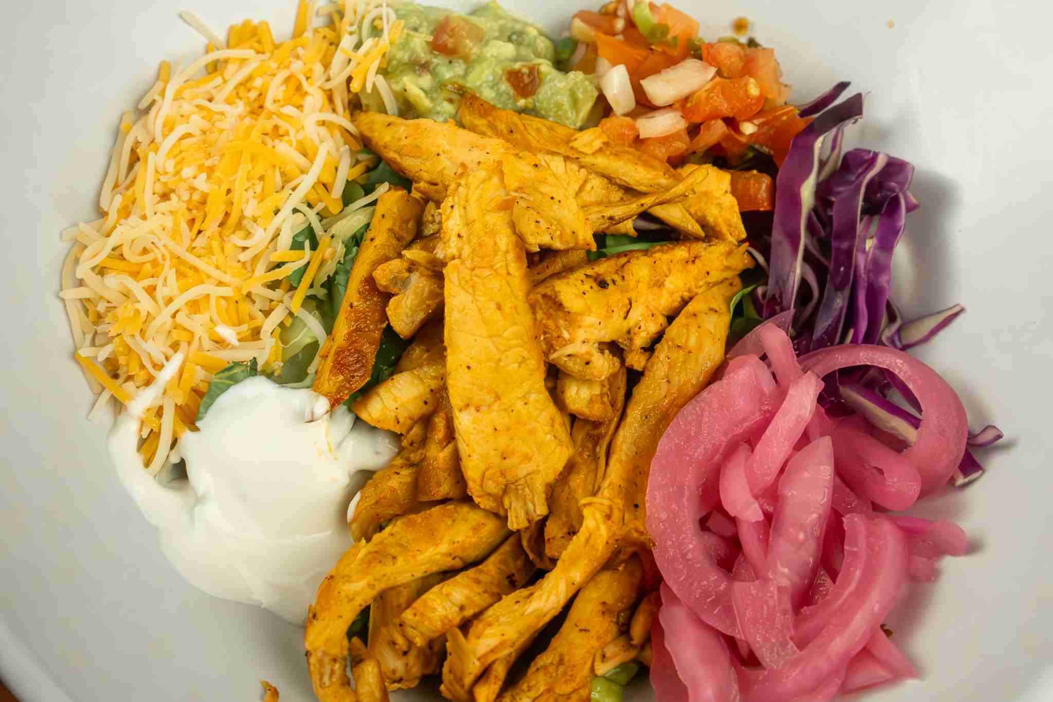 Chicken fajita, rice & egg whites topped with grilled peppers, onions, fresh pico de gallo & shredded cheese and your choice of
