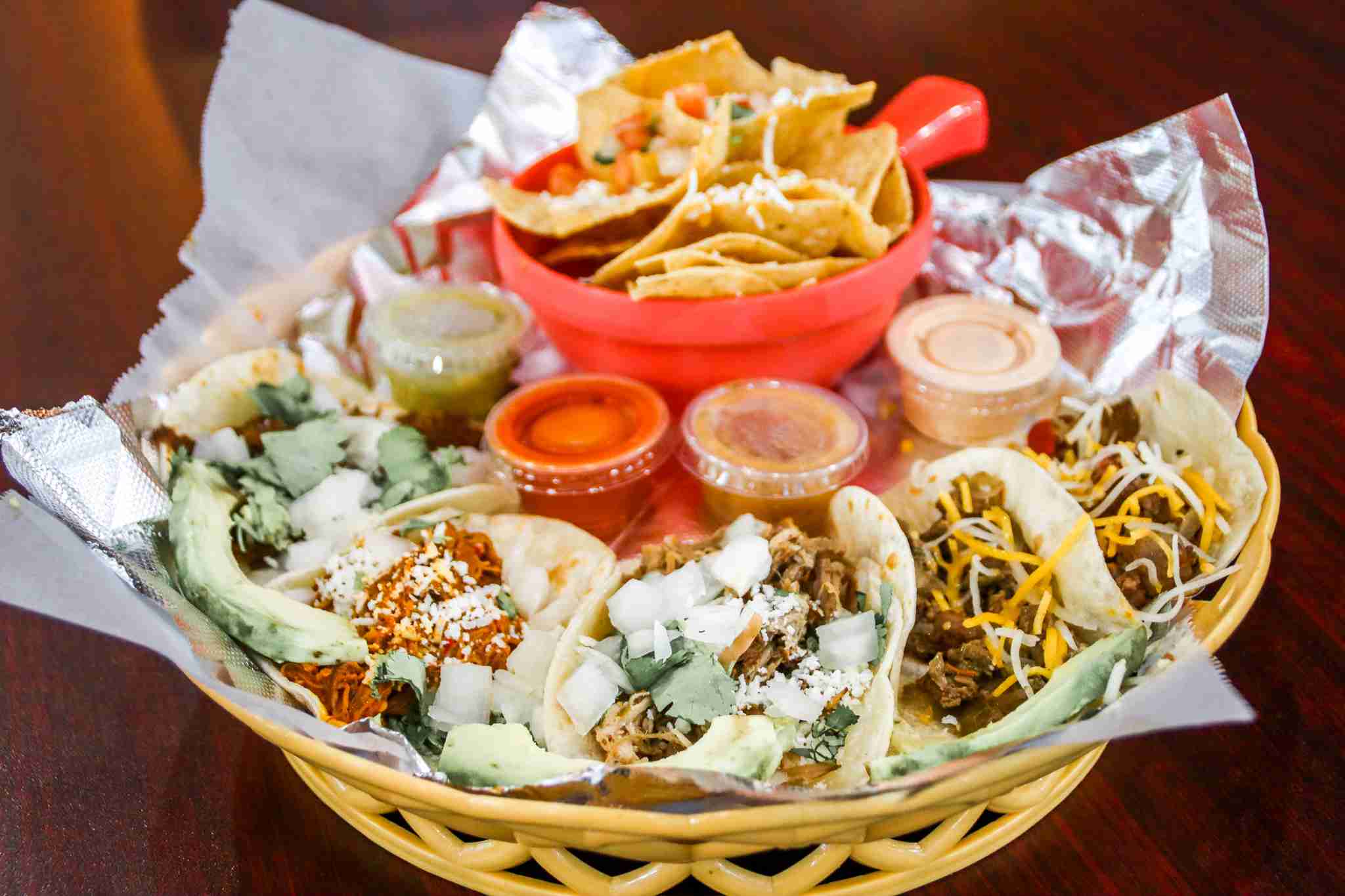 Sampler size tejano nachos served with 5 sampler guisado tacos: Carol Burnett, El Americano, El Alamo, El Picadillo and Las Carnitas.